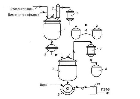 Переэтерификацию проводят в токе азота или углекислого газа при 200-230°С в течение 4-6 ч. Реактор снабжен насадочной колонной 2, которая служит для разделения паров этиленгликоля и метилового спирта. Метиловый спирт из холодильника 3 собирается в приемник 4, а возгоняющийся диметилтерефталат смывается в колонне этиленгликолем с насадки и возвращается обратно в реактор. После отгонки метилового спирта температуру в реакторе повышают до 260-280 °С и отгоняют избыточный этиленгликоль. Расплавленный дигликольтерефталат сливают через металлический сетчатый фильтр 5 в реактор 6. После его загрузки в течение 0,5-1 ч создают вакуум (остаточное давление 267 Па). Поликондеисацию проводят при 280 °С в течение 3-5 ч до получения расплава заданной вязкости. Выделившийся этиленгликоль отгоняют, конденсируют в холодильнике 7 и собирают в приемник 8. Расплавленный ПЭТ сжатым азотом выдавливают из реактора через