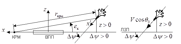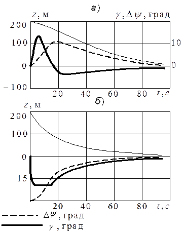Характер переходных процессов выхода самолета на ЛЗП для закона управления и типовых значениях передаточных чисел иллюстрирует рисунок. Для примера выбраны два различных начальных положения самолета. В обоих случаях длительность переходных процессов одинакова, но характер изменения углов крена зависит от начальных условий. Если самолет летит параллельным курсом ( Использование вместо линейного отклонения z угловой меры отклонение центра масс самолета от заданной траектории создает определенные трудности в формировании закона управления. При переходе к
