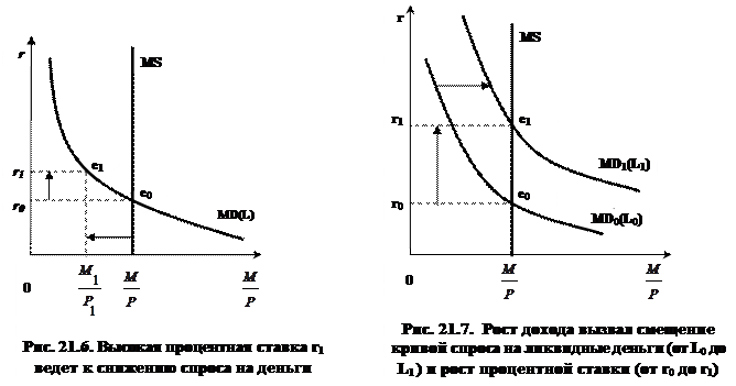 Равновесие на денежном рынке. В экономической системе функционируют рынок товаров, рынок денег, рынок ценных бумаг, рынок рабочей силы. Равновесие рыночной системы предполагает совместное или макроэкономическое равновесие этих рынков. Рынок денег является наиболее совершенным рынком, поскольку он чаще всего находится в равновесии. Нарушение равновесного состояния денежного рынка влечет за собой финансовый кризис. Равновесие на денежном рынке достигается при условии совпадения количества денег, находящихся вне банковской системы, с количеством денег, которое желает иметь население в своем «портфеле активов», т.е. когда предложение денег совпадает с совокупным спросом на деньги. Предложение денег MS не зависит от нормы процента. Исходя из определенной экономической политики, Центральный банк, как путем денежной эмиссии, так и путем управления денежными активами других банков, контролирует величину предложения денег. При неизменном предложении денег MS равновесие на денежном рынке устанавливается в процессе колебаний процентной ставки. Колебания процентной ставки вызывают изменения в совокупном спросе на номинальные деньги. На графике (рис. 21.4) предложение денег MS представлено вертикальной линией, спрос на деньги – убывающая функция ставки процента. В коротком периоде возможна ситуация, когда устанавливается процентная ставка ниже равновесной (рис. 21.5).