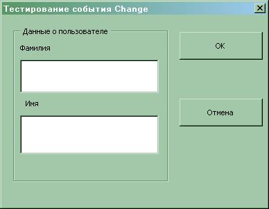 Для создания такой формы выполните следующее: 1. Создать новую форму с именем по умолчанию UserForm1. В Properties Window изменить свойство Caption этого элемента на Тестирование события Change. 2. Поместить на форму UserForm1 элемент Frame. По умолчанию его имя будет Frame1. Изменить свойство Caption этого элемента на Данные о пользователе. (Размеры элемента не важны.) 3. Поместить на форму в область Frame1 элемент TextBox (с именем по-умолчанию TextBox1) и элемент Label с заголовком (свойство Caption) Фамилия. Имя метки для данного случая не имеет значения. 4. Поместите на форму в область Frame1 элемент TextBox (с именем по-умолчанию TextBox2) и элемент Label с заголовком (свойство Caption) Имя. 5. Поместить на форму элемент CommandButton и изменить его свойство Name на Cancel_button,а свойство Caption на Отмена. Установить свойство Cancel в True, чтобы при нажатии на клавишу Esc программа выполняла ту же процедуру, что и при щелчке на кнопку Отмена. 6. Поместить на форму элемент CommandButton и изменить его свойство Name на OK_button, а свойство Caption на ОК. Изменить свойство Enabled этой кнопки на False. Этим вы кнопка ОК сделается недоступной для пользователя после выдачи диалогового окна на экран в режиме выполнения. Чтобы кнопка стала доступной, и приложение могло выполнить какую-либо работу с использованием кнопки ОК, пользователь должен будет изменить содержимое одного из текстовых окон. 7. Открыть модуль класса формы UserForm1 и записать в него код, представленный в примере 47. 8. Создайте форму UserForm2 (без элементов управления) и запишите в модуль класса этой формы код из примера 44.
