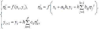 Метод такой структуры называют двухэтапным по количеству вычислений значений функции — правой части уравнения (22.1) — на одном шаге. Анализ устройства методов Рунге-Кутты второго порядка позволяет представить, в какой форме следует конструировать явный метод Рунге-Кутты произвольного порядка. По аналогии с предыдущим для семейства методов Рунге-Кутты р- го порядка используется запись, состоящая из следующей совокупности формул: