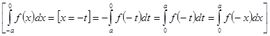 Интеграл по отрезку , симметричному относительно начала координат, от нечетной функции равен 0, а от четной функции равен удвоенному значению интеграла от этой функции по отрезку .