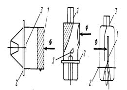 Рис. 2.3 – Конструкція деяких видів імпульсних потужнострумових фотоелементів [6]: анод; фотокадот.