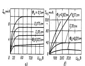 У паспорті приладу звичайно вказується номер типової характеристики відносної спектральної чутливості та абсолютне значення максимальної спектральної чутливості. Вольт-амперні характеристики фотоелементів. При освітленні фотокатода емітовані електрони утворять в просторі між електродами об'ємний заряд. Коли значення напруги анода мале, потенціал простору біля катода негативний, тобто має місце режим об'ємного заряду фотоелемента. Для плоскопараллельної та циліндричної системи електродів анодний струм фотоелемента має залежність від анодної напруги, близьку до закону ступеня трьох других. Анодний струм у фотоелементі, як і в вакуумному діоді, з'являється при невеликій негативній напрузі на аноді. Це пояснюється наявністю початкової кінетичної енергії в більшості фотоелектронів, що дозволяє їм переборювати гальмуюче поле анода. Коли напруга анода досягає певного значення, анодний струм стає рівним току фотоемісії і його ріст майже припиняється. Напруга насичення залежить від конструкції фотоелемента, типу фотокатода та від значення падаючого потоку випромінювання. Подальше підвищення напруги приводить до дуже слабкого зростання фотоструму за рахунок ефекту Шотткі та поліпшення збору електронів на анод. У фотоелементах з напівпрозорим фотокатодом, що має великий поздовжній опір (без провідної підкладки), при роботі в імпульсному режимі з більшими потоками випромінювання насичення фотоструму не відбувається. Це пов'язане із вторинною емісією електронів з вилучених від катодного вода ділянок фотокатода, які при протіканні струму уздовж шару здобувають позитивний потенціал. Різниця потенціалів між ділянками фотокатода може досягати значення, при якому коефіцієнт вторинної емісії буде більше одиниці. На рис. 2.4, а наведене сімейство вольт-амперних характеристик фотоелемента з масивним фотокатодом, а на рис. 2.4, б – фотоелемента з високим поздовжнім опором фотокатода. Світлові характеристики фотоелементів, що працюють у режимі насичення, відповідно до закону Столетова лінійні. При великих потоках випромінювання світлова характеристика відхиляється від прямої, що обумовлене утворенням об'ємного заряду або стомленням фотокатода. За межу лінійності світлової характеристики приймається значення анодного струму, при якому відхилення від прямої пропорційності фотоструму падаючому потоку випромінювання не перевищує заданого значення. У фотоелементів, що працюють у безперервному режимі, межа лінійності не перевищує 10-4 А. В імпульсному режимі опромінення при високих напругах анода це значення доходить до десятків амперів.