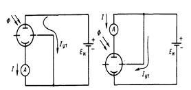 За аналогією з електронними лампами по сімейству вольт-амперних і світлових характеристик фотоелемента можна визначити чутливість і внутрішній опір R Опір навантаження може включатися в ланцюг анода або фотокатода. При заданої ЕРС джерела живлення опір навантаження вибирається таким, щоб робоча точка А лежала в межах області насичення вольт-амперних характеристик (рис. 2.5). У цьому випадку робоча світлова характеристика фотоелемента з навантаженням буде збігатися зі статичної, тобто залишатися лінійної в межах вимірюваних потоків.