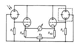 Ефективним способом зниження темнових струмів є використання балансових (мостових) схем включення фотоелемента. На рис. 2.7 показана схема балансового електрометричного катодного повторювача з фотоелементом у вхідному ланцюзі. Напруга від протікання темнового струму через резистор R 1 на вході лівої лампи компенсується на виході такою же напругою, що виникає від протікання струму затемненого фотоелемента через резистор R2 на вході правої лампи. Зміна вологості та температури навколишнього середовища викликає однакова зміна темнових струмів у двох плечах балансової схеми, тому вимірювальний прилад не реагує на ці зміни. При відсутності вимірюваного потоку потенціометром R о виробляється початкова установка вимірювального приладу на нуль.