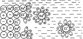 Рис. 5.1 Гидратация ионов Na и СГ при растворении NaCI из молекул растворителя и растворяемого вещества нестойких соединений переменного состава - сольватов (химический процесс). Менделеев, изучавший водные растворы, назвал эти соединения гидратами. Он установил, что соединение молекул или ионов растворяемого вещества с молекулами растворителя осуществляется главным образом за счет образования водородной связи или вследствие электростатического взаимодействия полярных молекул веществ. Особенно склонны к сольватации ионы. Сольватацию можно рассмотреть на примере растворения кристалла поваренной соли в воде (рис. 5.1) Диполи воды ориентируются вокруг отрицательных ионов хлора своим положительным полюсом, а вокруг положительных ионов натрия - отрицательным, т.е. происходит гидратация ионов. В результате этого процесса связь между поверхностно расположенными ионами в кристалле хлорида натрия ослабляется. Ионы натрия и хлора отрываются от кристалла, а молекулы воды образуют вокруг них так называемые гидратные оболочки. Отделившиеся гидратированные ионы под влиянием теплового движения перемещаются, равномерно распределяясь между молекулами растворителя. Под сольватацией понимают всю совокупность взаимодействий, осуществлящихся в растворе, которые в зависимости от природы растворителя и растворенного вещества могут иметь различную природу и проявляться по-разному. Например, сольватация молекул иода молекулами тетрахлорида углерода, молекул фосфора или серы молекулами сероуглерода осуществляется исключительно за счет слабого ван-дер-ваальсовского взаимодействия, но все же энергия сольватации оказывается больше, чем энергия взаимодействия частиц в молекулярных кристаллах. Как правило, из таких молекулярных растворов растворитель легко удаляется, а растворенное вещество остается в химически неизменном виде. При испарении растворителя из перечисленных растворов можно получить кристаллы иода, фосфора, серы. Это пример слабых сольватационных взаимодействий. Примером сильного сольватационного взаимодействия может служить взаимодействие воды с ионом Fe 3+. При растворении в воде безводного трихлорида железа молекулы Fe2CI6, из которых образован кристалл, настолько энергично взаимодействуют с молекулами воды, что не только распадаются на ионы, но и ион Fe3+ образует очень прочную комплексную частицу [Fe(H20)6]3+ . Если теперь удалять растворитель, то из раствора кристаллизуется не безводный хлорид, а так называемый кристаллогидрат - соединение с водой - FeCI3 * 6Н20, или, точнее, аквакомплекс [Fe(H20)6]CI3. Удалить из него воду и получить таким образом безводный FeCI3 невозможно. Например, при нагревании кристаллогидрата через ряд сложных форм происходит не только удаление воды, но и полный распад соединения с образованием оксида и газообразного HCI: 2[Fe(H20)6 ]CI3 = Fe203 + 6HCI + 9Н20.