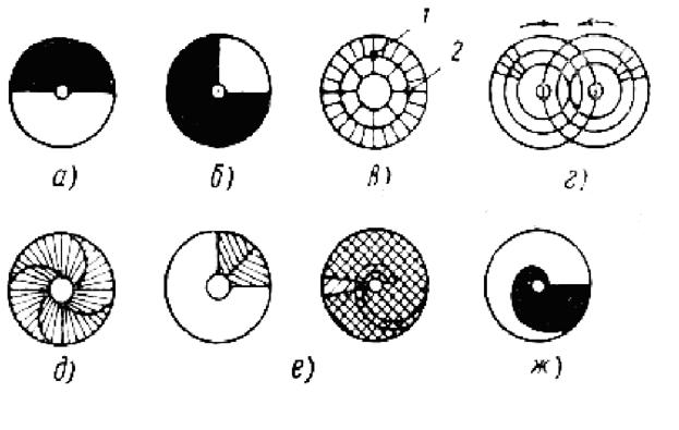 а, б, в, г – сигналы по принципу «да – нет», д – пропорциональные сигналы в декартовой системе координат, е и ж - пропорциональные сигналы в полярной системе координат