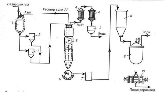 Рис. 27.1. Схема производства поликапроамида непрерывным методом: 1 — плавптель; 2 — фильтры; 3 — реактор; 4 — теплообменники; 5 — сборник; 6 — вращающийся барабан; 7 — резательный станок; 8 — бункер; 9 — промыватсль-экстрактор; 10 — вакуум-сушилка