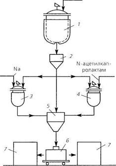 Рис. 27.2. Схема производства поликапроамида и формах: 1 — плавмтель; 2 — фильтр; 3 -смеситель капролактама с Na-солью капролактама; 4 — смеситель капролактама с N-ацетилкапролактамом; 5 — смеситель всех компонентов; 6 — форма; 7 –термошкафы