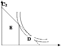 На рис. 25.3.1 показано, каким образом ограничение ликвидности сужает возможности выбора для домашнего хозяйства. Если домашнее хозяйство не имеет возможности занимать средства, то оно сталкивается с дополнительным ограничением — потребление в первом периоде не может быть больше, чем доход в первом периоде. Заштрихованная площадь представляет варианты потребления в первом и втором периодах, которые может выбрать потребитель. Выбор потребителя должен удовлетворять как межвременному бюджетному ограничению, так и ограничению ликвидности. Заштрихованная площадь показывает возможные сочетания потребления первого и второго периодов, которые совместимы с обоими ограничениями. На рис. 25.3.2 показано, как ограничение по заимствованию влияет на выбор оптимального сочетания потребления в первом и втором периодах. Когда потребитель сталкивается с ограничением ликвидности, то возможны две ситуации. На рис.2 потребитель решает в первом периоде потреблять меньше, чем получает дохода. В этом случае ограничение ликвидности не является существенным и не влияет на потребление. Такое ограничение ликвидности называется пассивным. На рис. 25.3.2 в потребитель стал бы потреблять больше, чем позволяет его доход в первом периоде, если бы не ограничение по заимствованию. В этом случае потребитель потребляет целиком весь доход первого периода. Потребитель решает занять средства и выбирает точку D. Но, поскольку заимствование невозможно, лучшим доступным ему выбором становится точка Е. При этом ограничение ликвидности влияет на выбор потребителя и поэтому называется активным.