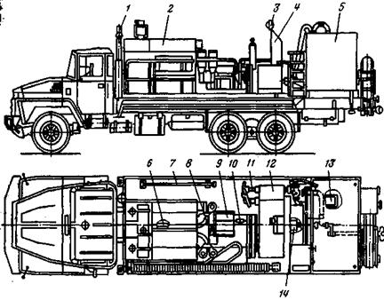 Рис. 26.6 – Общий вид насосной установки УНБ1-400х40 1 – выхлопная труба двигателя автомобиля; 2 – силовая установка; 3 – фара; 4 – пост управления; 5 – бак замерный; 6 – вал карданный; 7 – трубопровод вспомогательный; 8 – вал промежуточный; 9 – коробка передач; 10 – муфта зубчатая; 11 – манифольд; 12 – насос плунжерный; 13 – бачок цементировочный; 14 – насос центробежный водоподающий