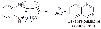 При конденсации о-аминобензальдегида с формамидом образуется бициклическая структура бензопиримидина: