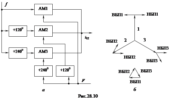 В этом случае n = 3 и напряжения в фазах сдвинуты соответственно на 1200 и 2400. В системе требуется три АМ генератора, работающих на общую нагрузку. АМ генераторы отличаются друг от друга только тем, что сигналы на них (модулируемый и модулирующий) подаются со сдвигами в 1200 и 2400. На рис.28.10, а указаны положительные сдвиги, но они могут быть и отрицательные. Также по одному сигналу сдвиг может быть положительный, а по другому – отрицательный. От этого зависит, сигнал какой боковой полосы (нижней или верхней) будет выделен. Принцип подавления колебания несущей частоты и одной боковой полосы поясняется векторной диаграммой рис.28.10, б. Чтобы понять векторную диаграмму, напомним общее выражение АМ колебания (24.5), когда модулируемый и модулирующий сигналы имеют начальные фазы