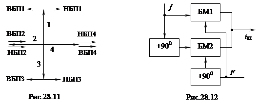 что в два раза уже ширины спектра модулирующего сигнала.[16] На выходах БМ1 и БМ2 сигналы НБП отличаются только сдвигом колебаний по фазе на 900. Описанная спектральная картина колебаний на выходах БМ1 и БМ2 представлена на рис.28.15.