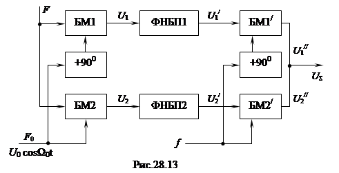 где k 1, k 2 – коэффициенты передачи по напряжению соответствующих фильтров; Если фазовые сдвиги, создаваемые фильтрами на одной и той же частоте одинаковы, то напряжения на выходах фильтров оказываются сдвинутыми ровно на 900. Далее работа оконечной части схемы, включающей балансные модуляторы БМ1/ и БМ2/ и фазовращатель на 900 на частоте f аналогична квадратурной схеме формирования однополосного сигнала (рис.28.12). При положительном фазовом сдвиге +900 на частоте f на выходе схемы (рис.28.13) будет выделен суммарный сигнал НБП. При этом на приёмной стороне потребуется восстановить частоту f – F 0. Если на частоте f обеспечить фазовый сдвиг –900, то выделится сигнал ВБП. Соответственно на приёмной стороне потребуется восстановить частоту f + F 0. Таким образом, при фазофильтровом способе формирования однополосного сигнала два низкочастотных напряжения с неизменным фазовым сдвигом в 900 получаются с помощью фазовращателя на фиксированной частоте Ω0, что не связано с особыми трудностями. Однако при данном способе формирования однополосного сигнала предъявляются жёсткие требования к амплитудным и особенно к фазовым характеристикам фильтров боковых полос. Создание двух ФНЧ с абсолютно идентичными фазовыми характеристиками в интересующей полосе частот может оказаться невыполнимой задачей. При фазофильтровом способе формирования однополосного сигнала поднесущая частота F 0 может быть выбрана из условия[14]