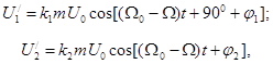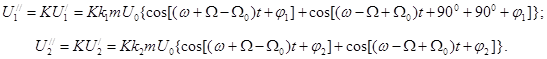 Процесс формирования однополосного сигнала в фазофильтровой схеме основывается на принципе квадратурной (многофазной) модуляции. В схему также входят два фильтра нижних частот, позволяющие исключить из схемы сложные широкополосные фазосдвигающие устройства (фазовращатели). На балансные модуляторы БМ1 и БМ2 поступают сигналы модулирующей частоты и два напряжения поднесущей частоты F 0: U 0cosΩ0t и U 0cos(Ω0t + 900), сдвинутые по фазе на 900. На выходах указанных модуляторов, которые считаем абсолютно идентичными, соответственно получаем напряжения[13]