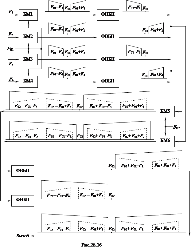 Плохое использование мощности передатчика при многоканальной работе требует серьёзного увеличения его мощности для обеспечения уверенного приёма. Иные условия создаются при радиосвязи на ОБП. Большой эквивалентный выигрыш в мощности при ОМ в значительной мере компенсирует проигрыш в использовании мощности передатчика при многоканальной работе. На рис.28.16 представлена структурная схема формирования однополосного сигнала, соответствующего многоканальному сообщению. Схема иллюстрирует формирование сигнала для передачи четырёх сообщений: F 1, F 2, F 3, F 4. Объединением двух таких схем можно сформировать сигнал для передачи восьми сообщений и т.д. Из приведенной схемы (рис.28.16) видно, что свободная боковая полоса одного канала используется для другого. Необходимо отметить, что передача нескольких сообщений по одному передатчику более целесообразна, нежели для каждого канала использовать свой передатчик, даже однополосный. В последнем случае потребовалось бы занять более широкую полосу частот в эфире с учётом взаимной нестабильности рабочих частот передатчиков. При многоканальной работе значительно повышается требование линейности усиления. Нелинейность усиления приводит к перекрёстным искажениям. Для обеспечения линейного усиления в маломощных каскадах однополосных передатчиков используют режим класса А, а в мощных – класса В. Кроме того, при необходимости весь усилительный тракт передатчика охватывают специальными видами отрицательной обратной связи. При настройке однополосные передатчики испытывают на перекрёстные искажения путём одновременной модуляции двумя сигналами разных звуковых частот с равными амплитудами. При этом амплитуды колебаний комбинационных частот модуляции в выходном сигнале не должны превышать (1 – 3)% от амплитуд колебаний полезных частот.