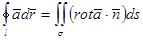 Циркуляция поля замкнутому контуру равна потоку вихря через любую поверхность , лежащую в векторном поле и имеющую своей границей контур :