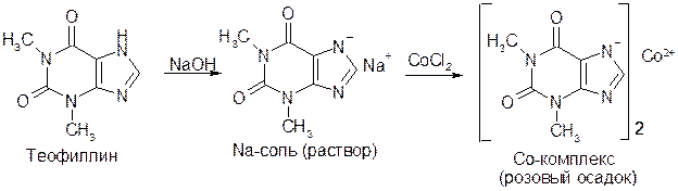Оснóвные свойства метилированных ксантинов выражены очень слабо. Их соли с минеральными кислотами гидролизуются. В то же время теофиллин и теобромин обладают NH-кислотностью: они образуют растворимые соли со щелочами, а ионами переходных металлов дают нерастворимые окрашенные комплексы: с ионами Со2+ теофиллин дает комплекс розового цвета, а теобромин – голубого. Эти реакции применяются для их качественного определения: