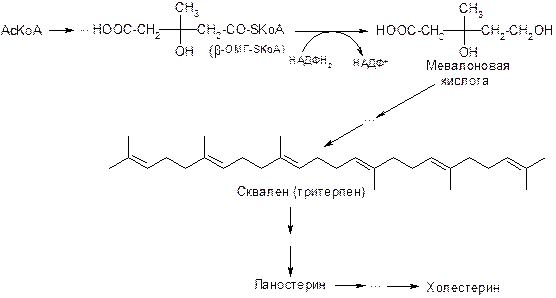 Холестерин попадает в организм с пищей, а также образуется в организме из AcKoA по следующему пути: