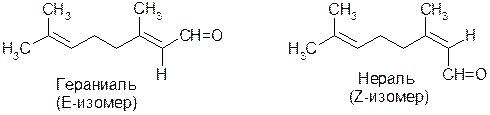 В маслах лимонной корки и эвкалипта содержится терпеновый альдегид цитраль. Он представляет собой смесь двух геометрических изомеров – гераниаля (90%) и нераля: