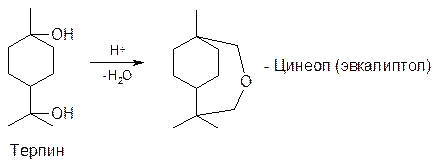 При гидрировании дипентена образуется ментан (доказательство строения дипентена). Последовательная гидратация дипентена дает α-терпинеол и терпин. α-Терпинеол – жидкость с запахом сирени, содержится в скипидаре и эфирных маслах. Терпинеолы (смесь изомеров) в виде ацетата применяются для составления парфюмерных композиций, обладают антибактериальными свойствами. Терпин в виде гидрата применяется как отхаркивающее средство при бронхите. При дегидратации терпина в разбавленной кислоте образуется цинеол (эвкалиптол):
