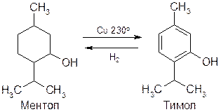 Ментол – бесцветное кристаллическое вещество с мятным запахом, холодящим вкусом и охлаждающим действием при нанесении на кожу. При 230о в присутствии меди ментол дегидрируется, образуя ароматическое соединение – тимол, который в тех же условиях в присутствии водорода переходит в ментол (рацемат). Последняя реакция служит методом синтетического получения ментола: