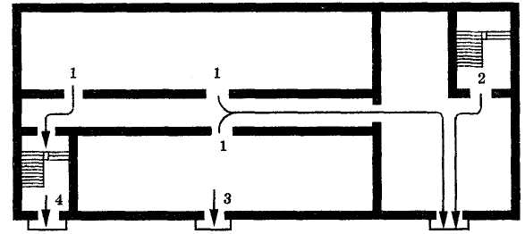 Малюнок 2. Евакуаційні виходи з приміщень першого поверху: 1- вихід з приміщення в коридор, який веде крізь вестибюль або сходову клітку безпосередньо назовні; 2 - вихід із сходової клітки крізь вестибюль назовні; 3 - вихід з приміщення безпосередньо назовні; 4 - вихід із сходової клітки безпосередньо назовні