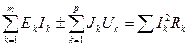 мұндағы, n – контурға кіретін тармақтар саны. Кирхгофтың заңдарын тізбектерді есептеуде қолдану Электр тізбектерін талдау немесе есептеу тізбектің және тізбек элементтерінің электрлік күйін анықтап, белгісіз параметрлері мен электрлік шамаларын табу деп түсініледі. Тізбектің электрлік күйі ұғымы өте кең ұғым болғанмен, көп жағдайда Кирхгофтың екінші заңы бойынша жазылған өрнекті тізбектің электрлік күйінің теңдеуі деп атайды. Тізбектерді Кирхгоф заңдарын қолданып есептегенде белгілі-бір реттілікті ұстанған жөн. Мысалы, 1.1.1-суретте келтірілген тізбекте энергия(қорек) көздерінің ЭҚК-тері мен кернеулерінің және пассивті элементтерінің кедергілерінің сан мәндері белгілі де, токтарды, тізбек элементтерінің кернеулерін, қуаттарын және жұмыс әлпін анықтау керек болсын. Әдетте токтардың нақты (шын) бағыттары белгісіз болатындықтан, алдымен олардың шартты оң бағыттары еркінше (қалауынша) таңдап алынады да, тізбектің электрлік схемасында стрелкамен көрсетіледі. Бұдан кейін Кирхгофтың бірінші заңы бойынша бір түйіннен басқа түйіндер үшін теңдеулер жазылады. Қарастырып отырған тізбекте екі түйін бар, ендеше Кирхгофтың бірінші заңы бойынша бір теңдеу құру керек: a түйінінде б түйінінде Белгісіз шамаларды табу үшін құрылатын теңдеулер саны белгісіздер санына тең болуы шарт. Қарастырып отырған теңдеуде үш ток бар, ендеше өзара тәуелсіз үш теңдеу құру керек. Сондықтан қалған жетіспейтін теңдеулер Кирхгофтың екінші заңы бойынша тәуелсіз контурлар үшін жазылады. Кирхгофтың екінші заңы бойынша теңдеулер жазу үшін контурларды айналып өту бағыты еркінше таңдап алынады. Қарастырылып отырған тізбекте бірінші және екінші контурларды сағат тілінің бағытында айналып өту қабылданған. Ал жалпы алғанда әртүрлі контурларды әртүрлі бағытта айналып өтуге болады. Контурларды айналып өткен кезде, егер кернеу көзінің кернеуі, ЭҚК және пассивті элементтегі ток, айналып өту бағытымен бағыттас болса, онда олар оң таңбамен, ал қарсы бағытта болса теріс таңбамен алынады. бірінші контурында екінші контурында Құрылған теңдеулер жүйесі ретінде шешіліп, белгісіз токтар анықталады. Теңдеулер жүйесінен токтар анықталған кезде, олардың бірқатары оң таңба, ал кейбіреулері теріс таңба қабылдайды. Бұл оң таңбалы токтардың шын бағыттарының еркінше алынған бағыттарымен бағыттас та, теріс таңбалы токтардың шын бағыттарының еркінше алынған бағыттарына қарсы бағытта екендігін көрсетеді. Қуаттар балансы.Тізбектің пассивті элементтері, олармен токтың қай бағытта жүріп жатқанынан тәуелсіз энергия тұтынып тұрады. Әдетте, тізбек элементтерінің электр энергиясын қаншалықты қабылдап немесе өндіріп тұрғандығын салыстырмалы көрсету үшін олардың қуаты алынады. Тізбектің элементінің қуаты деп уақыт бірлігі ішінде осы элементте тұтынылған немесе өндірілген электр энергиясын айтады. Тізбек элементінің қуаты, жалпы алғанда, оның кернеуі мен тогының көбейтіндісіне тең. Пассивті элементтің қуаты әрқашанда оң таңбалы және келесі формуламен анықталады.