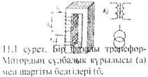 Трансформаторлар әртүрлі міндет атқарғанымен оларлың негізгі құрылысы және әрекеттік нарқылары бірдей. Сондыктан трансформатордың әрекеттік: нарқын және әртүрлі жұмыс алпілерін бір фазалы трансформатор арқылы қарастыруға болады. Транеформатор ферромагнитті магнит өткізгіш өзектен және кем дегенде екі орамадан тұрады (11.1 -сурет). Орамалар трансформатордың түріне қарай өзекте бірінің үстіне екіншісі, қат р немесс зр жерге ораналасуы мүмкін. Орамалардың бірі кернеу кезіне қосылады да біріншігәр орама дел, ал екіншісінің кысқыштарына электр қабылдағьштар қосылады да екіншігәр орама деп аталады. Орамалардың орамдары бір - 6ipiмен және өзекпен оқшауланған. Өзек қалыңдығы 0.3...0,5 мм трансфер чаторлық болат парақшалардан жиналған.