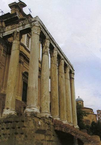 Обострение внутренних противоречий уже во второй половине II в. н. э. привело к кризису имперского искусства. Строительство в Италии и в самом Риме существенно сократилось. Памятники этого времени отмечены холодностью и сухостью форм. Архитектура императорского Рима зашла в тупик. Вывести из него могло только искусство провинций. В скульптуре появились подчеркнуто натуралистические, грубоватые формы, которые впоследствии привели к формированию нового стиля в римском искусстве. Строительная деятельность преемников Адриана переживала глубокий кризис. Император Антонин Пий (Благочестивый) в 141 году воздвиг храм Антонина и Фаустины в память своей безвременно скончавшейся супруги. Сохранилась передняя часть храма с довольно глубоким портиком из десяти колонн коринфского ордера. Базы и капители колонн были выполнены из белого, а стволы – из серо-зеленого эвбейского мрамора. Этот прием уже использовался ранее Адрианом в храме Венеры и Ромы, в римском Пантеоне. Ничего нового в архитектуру его преемник не внес. Пытаясь поддержать былые традиции римской классики эпохи Августа, скульпторы тщательно выполнили рельефы на фризе, украсив его черными грифонами, изображениями канделябров и растительным орнаментом (рис. 9.1).