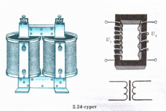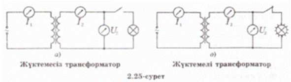 Жүктемелі трансформатор Екінші реттік тізбекке қандай да бір жүктеме қосайық (2.25, ә-сурет). Онда бұл тізбекте жиілігі бірінші реттік тізбектегі ток жиілігіне тең i2 айнымалы ток туады. Сондықтан екінші катушкада өздік индукция ЭҚК-і пайда болады, оның үштарындағы кернеу аздап төмендейді. Ленц ережесі бойынша өздік индукция ЭҚК-і магнит ағынын азайтады. Бұл магнит ағыны екі катушканы бірдей тесіп өтетін болғандықтан, оның азаюы бірінші реттік катушкадағы өздік индукция ЭҚК-і | Epsilon1-дің кемуіне әкеп соғады. Ал, онда бірінші тізбекте U1 кернеудің мәні тұрақты болса да ток күші артады. Өз ретінде бірінші реттік тізбектегі ток күшінің өсуі магнит ағынының артуын тудырады, онда екінші реттік тізбектегі индукциялың ЭҚК-і мен ток күші артады. Бұдан әрі осы сипатталған процестер берілген жүктеме үшін белгілі бір магнит ағыны, екінші реттік тізбектегі индукциялық ЭҚК-і жәнө бірінші реттік тізбектегі I1 ток күші түракталғанша жүре береді. Енді трансформатор генератордан өзінің зая жүрісіне қарағанда екінші реттік тізбек тұтынатын қуатқа тең қуатты көбірек алады. Егер аздаған энергия шығынын ескермесек, энергияның сакталу заңы бойынша, генератордың энергиясы бірінші реттік тізбектен екінші реттік тізбекке магнит өрісі арқылы беріледі. Сондықтан шығынды ескермей, былай жазуға болады: I1U1 = I2U2, бұдан