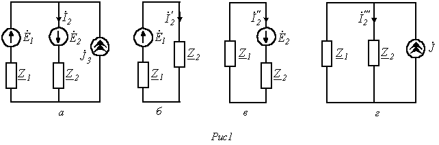 // Принимая источники в цепи на рис. 1,а идеальными и учитывая, что у идеального источника ЭДС внутреннее сопротивление равно нулю, а у идеального источника тока – бесконечности, в соответствии с методом наложения приходим к расчетным схемам на рис. 1,б…1,г. В этих цепях