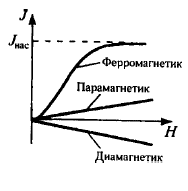 Кривая намагничивания. Намагниченность слабомагнитных веществ (пара и диамагнетики) изменяется с напряженностью поля линейно (рис.24.6). Намагниченность ферромагнетиков зависит от
