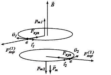 Для простоты положим, что вектор индукции перпендикулярен плоскости орбиты электрона. В этом случае на электрон действует две силы – кулоновская сила притяжения к ядру и сила Лоренца. Их равнодействующая сообщает электрону центростремительное ускорение. Для 1-го электрона: