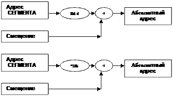 Адрес сегмента хранится в одном из сегментных регистрах (ОСНОВНЫЕ - CS, DS, SS, дополнительные ES, FS, GS). Итак, для адресации используется два числа: адрес сегмента и смещение (рис. 5). Сегменты начинаются через 10h и перекрываются друг с другом.