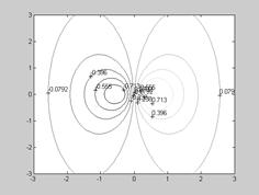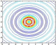 Множество всех точек М из области V, в которых выполняется равенство Замечание: дляплоского поля Для построения линий уровня соответствующих поверхностей в среде Matlab используются функции contour: contour(X,Y,Z) – строит линии уровня для поверхности Z =Z(X,Y), contour(X,Y,Z,n) - то же с указанием числа линий уровня (по умолчанию 10), contour(X,Y,Z,v) - то же для массива указанных значений; contour(Z), contour(Z,n), contour(Z,v) - аналогичные функции без указания диапазонов для аргументов contour(...,LineSpec) - аналогичные функции c указанием типа и цвета линий (см. plot); [C,h]=contour (...) возвращает массив С и вектор дескрипторов, позволяя тем самым продолжить работу с рисунком (давать оцифровку линий, заголовки и др.). Функция contourf(...) закрашивает области между линиями уровня, аналогична contour(...) с разницей в формате [C,h, cf]=contour (...), где cf определяет матрицу раскраски. Функция contour3(...) по синтаксису полностью аналогична contour(...),изображает линии уровня в пространственной интерпретации; так команда [c,h]=contour3(x,y,z,20); дает фигуру (рис.3). Пример 1: построить линии уровня заданной поверхности
