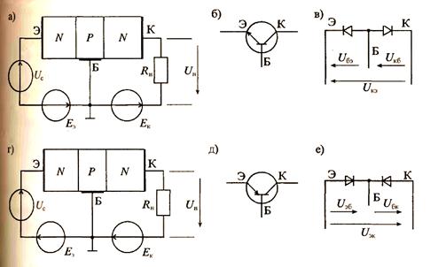 Устройство и принцип действия биполярного транзистора. Биполярным транзистором называется полупроводниковый прибор, имеющий два взаимодействующих между собой p-n-перехода. Технология изготовления биполярных транзисторов может быть различной — сплавление, диффузия, эпитаксия, — что в значительной мере определяет характеристики прибора. В зависимости от последовательности чередования областей с различным типом проводимости различают n-р-n-транзисторы и p-n-p-транзисторы. Упрощенное устройство плоскостного n-р-n-транзистора приведено на рис. 1 а, его условное обозначение — на рис. 1 б, а схема замещения — на рис. 4.1 в. Аналогичные представления для p-n-p-транзистора приведены на рис. 4.1 г, д, е.
