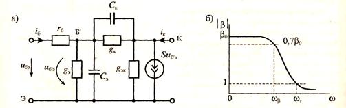 Рис. 6.8. Схема замещения транзистора на высокой частоте (а) и частотная зависимость коэффициента передачи тока базы (б)