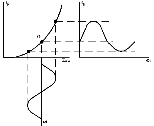 Характерный вид сквозной характеристики (5.2) представлен на рис. 5.11. При синусоидальной Э.Д.С. ЕВх ток коллектора изменяется по несинусоидальному закону и характеризуется заостренной верхней и уплощенной нижней полуволнами (см. рис.5.11).