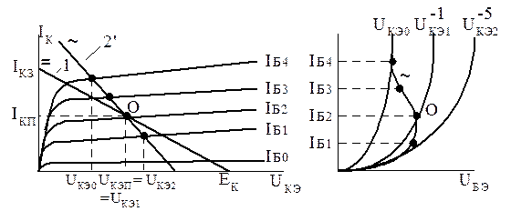 Аналогично построим динамическую входную характеристику для схемы с ОЭ (см. рис. 5.15). Из рисунка следует, что динамическая входная характеристика для схемы с ОЭ более нелинейна, чем статические, это означает, что схема с ОЭ имеет большие нелинейные искажения, чем схема с ОБ. Рассмотрим методику построения сквозной характеристики каскада, учитывающую нелинейность входных и выходных ВАХ. Усилитель может работать с источником Э.Д.С. и источником тока. Для установления связей между входными током и Э.Д.С. с выходным током IК выполним построения, приведенные на рис. 5.16. В первом квадранте расположены выходные характеристики транзистора с нагрузочной линией по переменному току (2') проходящей через рабочую точку по постоянному току "О". Во втором квадранте строят переходную характеристику (1) каскада, связывающую входной ток (IЭ) с выходным током (IК) через точки пересечения нагрузочной линии с выходными характеристиками транзистора.