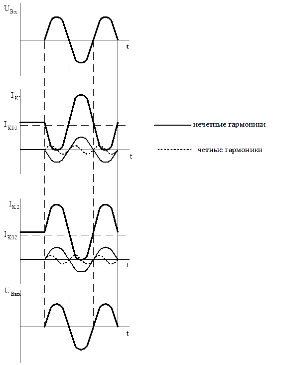 Для нечетных гармоник (1,3,5, …), которые совпадают с IK, получим, что в трансформаторе ТР1 IК 1× W 1 и IК 2× W 1 направлены в одну сторону, следовательно, мощность в нагрузке удваивается: PH =2× P. Для четных гармоник, IК1×W1 и IК2×W1, направленых в трансформаторе ТР1 в противоположные стороны, результующая намагничивающая сила при идеальной симметрии равна нулю, следовательно, отсутствуют нелинейные искажения по четным гармоникам. Постоянные составляющие, как и четные гармоники, также включены встречно и обеспечивают режимы работы выходного трансформатора без подмагничивания. Поскольку абсолютно симметричных трансформаторов и транзисторов нет (даже при применении интегральных микросхем — сборок транзисторов), то в формулы нелинейных искажений введен коэффициент асимметрии b, учитывающий степень асимметрии транзисторов. Для подобранных транзисторов и сборок транзисторов в интегральном исполнении (b =0.01¸0.05), при этом искажения настолько малы, что ими часто пренебрегают. Для неподобранных транзисторов (b =0.1¸0.15) 7и нелинейные искажения определяют из выражения: