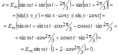 Последовательное кольцевое соединение обмоток генератора не приводит к их короткому замыканию, как это было бы при подобном соединении аккумуляторов, так как в симметричной системе сумма ЭДС, действующих в контуре треугольника, в любой момент времени равна нулю