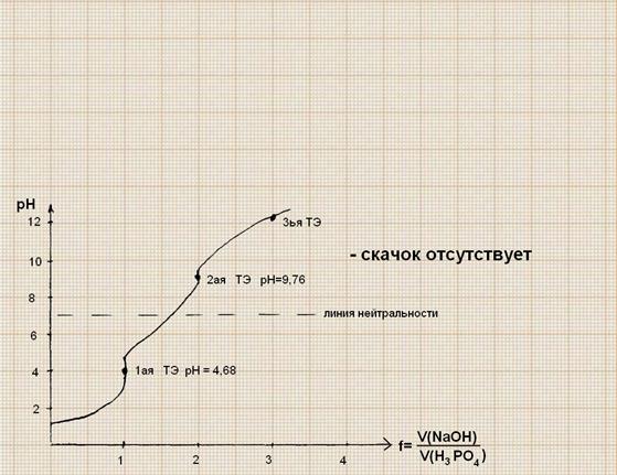 Многоосновные (син. полипротонные) кислоты H2SO3, H3PO4 и др. диссоциируют ступенчато. Const диссоциации по I ступени > Кдисс по II ступени > Кдисс по III ступени и т.д.. Диссоциация кислоты по I ступени подавляет диссоциацию по последующим ступеням. Поэтому при титровании многоосновных кислот сильными основаниями вначале оттитровываются H+, соответствующие I ступени, затем II ступени и т.д.. Поэтому на кривой титрования могут появляться скачки для каждой ступени нейтрализации кислоты. Рассмотрим пример: H3PO4 титруем NaOH. Для H3PO4: К1 = 10-3 К2 = 10-8 К3 = 10-13 Различия в К1,К2 и К3 достаточны, чтобы разделились скачки на кривой титрирования. Однако, К2 и К3 – малы => второй скачок проявляется нечетко, а третий – вообще не проявляется. Трем ТЭ соответствуют реакции: Первый скачок: NaOH + H3PO4 = NaH2PO4 + H2O, К1 = 7,1*10-3 Второй скачок: NaOH + NaH2PO4 = Na2HPO4 + H2O, К2 = 6,2*10-8 Третий – отсутствует: NaOH + Na2HPO4 = Na3PO4 + H2O, К3 = 5*10-13