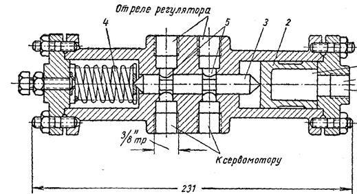 Фиг. 300. Автоматический клапан АК-1. стие 1 подается масло от трехходового соленоидного клапана. Масло давит на поршень 2 и перемещает его влево. Вместе с поршнем передвигается золотник 3, который при своем движении сжимает пружину 4 и перекрывает два отверстия 5, через которые поступает масло от струйного реле к исполнительному механизму (сервомотору). Такое состояние будет сохраняться до тех пор, пока не прекратится подача давления в камеру 6. При прекращении подачи масла от трехходового соленоидного клапана пружина 4 разжимается и приводит всю систему в исходное положение. Путь для прохождения масла от струйного реле к исполнительному механизму (сервомотору) открывается, и работа регулятора возобновляется. Кроме одинарных автоматических клапанов АК-1, применяются также сдвоенные клапаны АК-2,