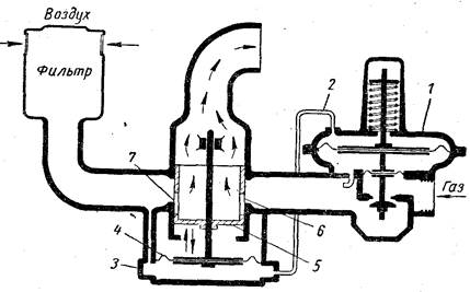 Для регулирования соотношения газ — воздух применяются мембранные регуляторы и инжекционные горелки. На рис.5 показана схема автоматического мембранного устройства для точного регулирования соотношения газа и воздуха. Устройство состоит из двух приборов — регулятора 1 давления газа, выравнивающего его давление с помощью воздухопровода 2 до давления воздуха, и мембранного регулятора 3 соотношения объемов газа и воздуха. В регуляторе / давления газа верхняя часть связана с воздухопроводом 2, а нижняя с