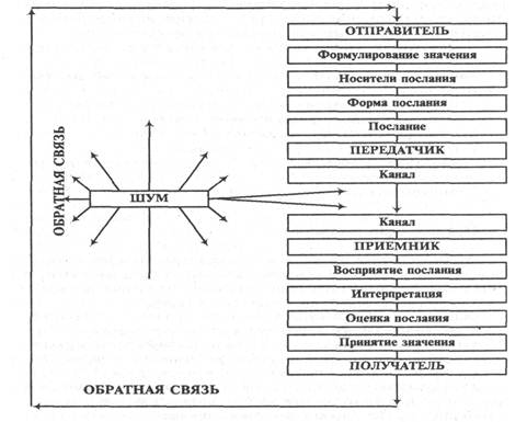 Рис.1. Модель коммуникационного процесса В процессе коммуникации формируется послание или то, что пошлет отправитель. Послание содержит данные определенного значения. Смысл или значение послания представляют собой принадлежащие отправителю идеи, факты, ценности, отношения и чувства. Послание посредством передатчика поступают в передающий канал, с помощью которого оно путешествует в направлении заданного адресата. Передатчики — это сам человек (его тело и голос), технические средства (телефон, радио, видеофон, телекс, телефакс, телевизор, компьютер, робот и т.п.), химическое или физическое состояние среды (жидкость, газ. твердые вещества, радиация, свет и т.п.). Каналы — это сама среда (воздух, вода и свет), различные технические устройства и приспособления (линии, волны и т.п.). С этого момента заканчивается этап отправления в процессе коммуникации и начинается этап получения передаваемой информации и уяснения еезначения. Канал выводит послание на приемник или средство, которое фиксирует получение данного послания по другую сторону канала. Тот, кого достигло послание, называется получателем. Его роль заключается не только в фиксации получения послания, но и, в значительной степени, в раскодировании этого послания в понятную и приемлемую для него форму. Раскодирование включает восприятие (что получил) послания получателем, его интерпретацию (как понял) и оценку (что и как принял). Оказывается, получить еще не означает понять, а понять это еще не значит принять. Известно, что если кто-то вас понял, это еще не значит, что он с вами согласен. Эффективная коммуникация устраняет причину непринятия. В этом главная сложность коммуникации. Оценка или принятие значения послания во многом базируется на той системе критериальных ценностей, которой придерживается получатель. Общий язык помогает раскодированию: «Понять с полуслова». Точность коммуникации оценивается по отношению к идеальному состоянию (когда намерение значения отправителя послания равно интерпретации этого значения получателем). Возможные искажения в значении послания связаны с наличием в процессе коммуникации шума. Шум - это любое вмешательство в процесс коммуникации на любом из его участков, искажающее смысл послания. При наличии среды шум существует априори. Шум влияет на частоту повторения сигнала или на повышение его интенсивности. Шумом может быть: звуковые ошибки в произношении; наличие более сильного параллельного сигнала; языковые ошибки; искажения в линиях связи; добавление к посланию «своего» на различных уровнях и т.д. Обратная связь появляется в результате обмена участников процесса ролями. Получатель становится отправителем и наоборот. Таким образом, весь цикл повторяется вновь, но уже в другом направлении. Обратная связь - это ответ получателя на послание. Она дает возможность отправителю узнать, дошло ли послание до адресата и в каком значении. Обратная связь может выступать как прямая (непосредственно наблюдаемое изменение поведения) и косвенная (снижение производительности, текучесть кадров, прогулы, конфликты и т.п.).