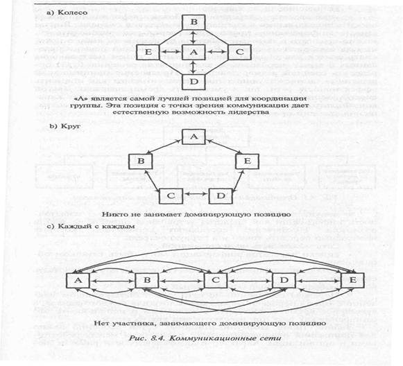 На рис. 8.4 изображены коммуникационные сети для группы из пяти человек. Возникает вопрос: которая из сетей лучше. Лабораторные эксперименты показывают, что «колесо» надежней, если проблема, которую необходимо решить проста. Сеть типа «каждый с каждым» (all-channel) стимулирует создание хорошего морального климата и приспособляемости. Р. Лайкерт, предложивший такую форму организации, как пересекающиеся рабочие группы, рекомендует сеть типа «каждый с каждым», поскольку она стимулирует обмен мнениями в рабочей группе. Такая сеть обычно используется в различного рода комитетах, если только председатель не настаивает на том, чтобы все связи проходили через него. Элемент А в «колесе» занимает наилучшую позицию с точки зрения координации деятельности группы. Работа группы зависит от формальных полномочий А. Он может препятствовать либо способствовать деятельности группы. Действуя в качестве некоторого фильтра, А может также влиять на распределение позиций членов группы. Если на А замыкается слишком большое число каналов, то А перегружен. «Колесо» не годится в том случае, когда решение проблемы зависит от взаимного обмена идеями и постоянной обратной связи. Предположим, что директору по вопросам маркетинга (рис. 8.5) необходимо разработать стратегию маркетинга: какая коммуникационная сеть должна быть принята? «Каждый с каждым» была бы наиболее приемлемой, поскольку участники обсуждали бы свои идеи всей группой по мере необходимости. Это обеспечивало бы всестороннюю проверку идей и устранение конфликтов. Напротив, если директор по вопросам маркетинга принимает решения только о сроках проведения ежегодных совещаний по сбыту, «колесо» будет более подходящей сетью, поскольку для такого решения директор просто запрашивает соответствующую информацию у подчиненных.
