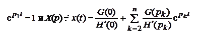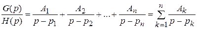 где G (p) и H (p) – полиномы от р, причем будем полагать m < n (m – степень полинома в числителе, n – в знаменателе). Предположим, что H (p) = 0 не имеет кратных корней, а также не имеет корней, равных корням уравнения G (p) = 0. При указанных условиях рациональную дробь можно разложить на простейшие дроби